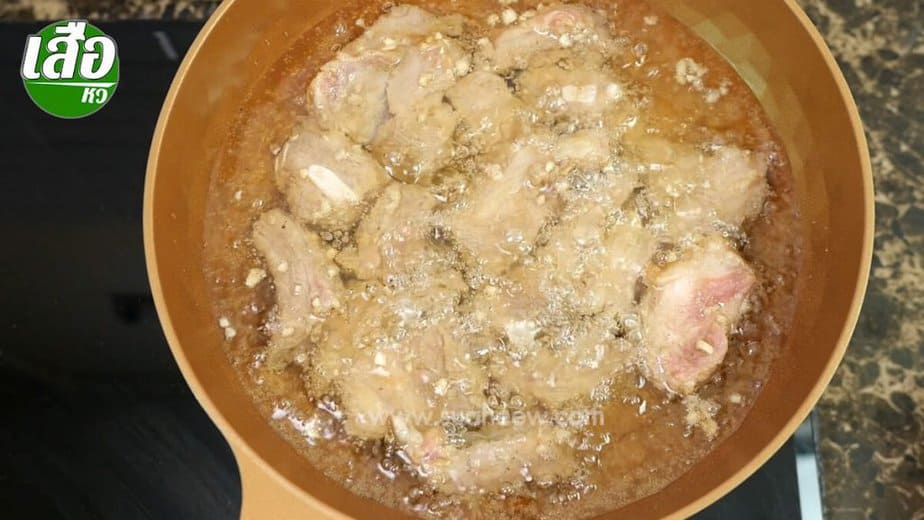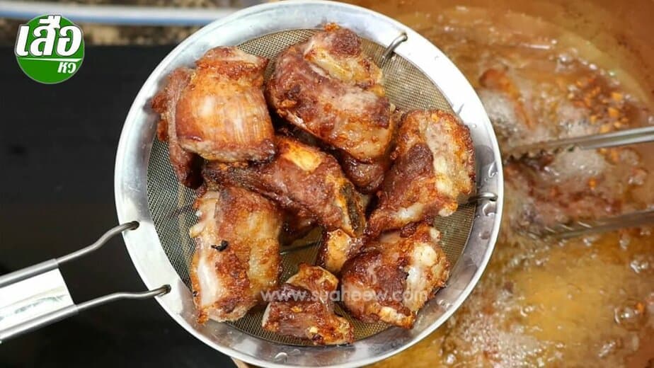 3.ตั้งกระทะใส่น้ำมันพืช พอน้ำมันร้อนแล้วก็ลดไฟลงเป็นไฟกลาง ค่อย ๆ นำกระดูกหมูอ่อนลงทอด ทอดให้กระดูกหมูอ่อน สุกเหลืองครบทุกด้าน ใกล้สุกแล้วก็เร่งไฟให้แรงขึ้นเพื่อรีดน้ำมันออก เสร็จแล้วก็ตักขึ้นมาพักไวในกระดาษซับน้ำมัน พร้อมรับประทาน