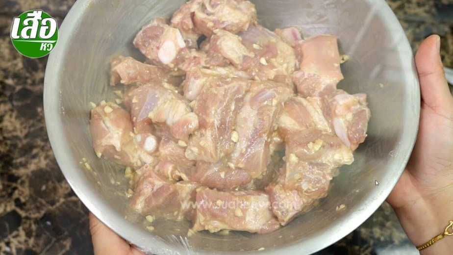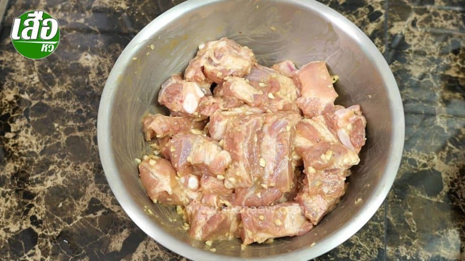 2.หมักกระดูกหมูอ่อนด้วยซอสหอยนางรม 2 ช้อนโต๊ะ ซอสปรุงรส 4 ช้อนโต๊ะ น้ำตาลทราย ครึ่งช้อนโต๊ะ แป้งมัน 2 ช้อนโต๊ะ จะช่วยทำให้กระดูกหมูมีความนุ่ม ทานได้ง่ายขึ้น คนส่วนผสมให้ละลาย ตามด้วยกระเทียมสับ เสร็จแล้วนำกระดูกหมูอ่อนลงไปคลุกเคล้าให้เข้ากัน เพิ่มความหอมด้วยพริกไทยป่น และคลุกเคล้าส่วนผสมให้เข้ากันอีกครั้ง และนำไปแช่ในช่องฟรีซประมาณ 1-2 ชั่วโมง